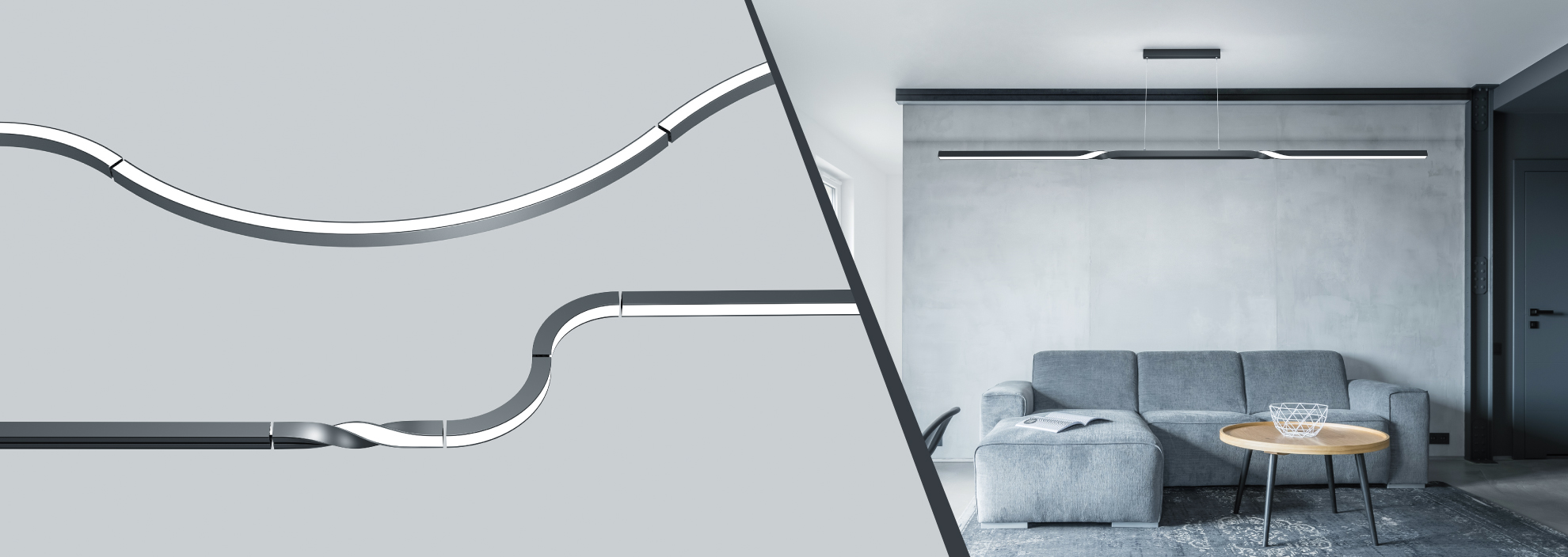 Вторая часть новинок этой серии — профили TWIST, скрученные вправо и влево на 90 или 180°. С их помощью можно менять направление свечения светильника, что позволяет составлять всевозможные комбинации из профиля и создавать действительно уникальные интерьерные решения. Для скрученных профилей созданы специальные широкие светодиодные ленты RT-A140 шириной 20 мм. За счет особой конструкции лента может легко скручиваться без деформации и сдвига на скрученных участках профиля.